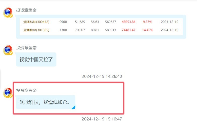 比如我们的另外一只票,是本周新开仓的票,我已经买了两次,第一买入之后跌了5个点,加仓,加仓之后今天涨了7个点,暂时不动,如果继续涨继续不动,如果跌回来我考虑继续加仓,把润欣减仓出来的仓位加到这个票上来,逢低买,逢高卖才是硬道理,这是跟随量化的节奏,量化的核心就是做差价交易,低买高卖,制造波动,做差价,我们现在也是这么干,减少追高,主要仓位做低吸。