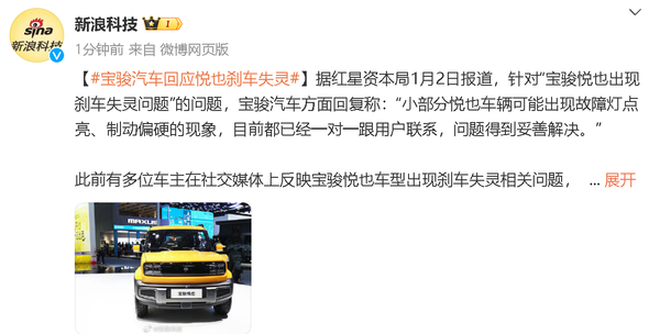 宝骏回应悦也刹车失灵:少数车辆故障 已妥善解决