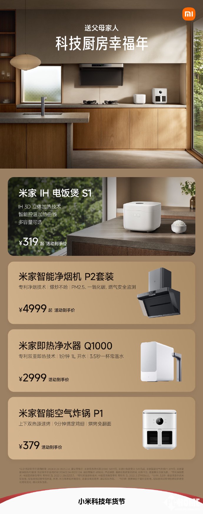 想要为厨房增添好物,米家IH电饭煲S1活动到手价319元,支持IH 3D立体加热技术、拥有智能控温加热曲线;米家智能净烟机P2套装拥有专利净烟技术、支持PM2.5一氧化碳、燃气安全监测,活动到手价4999元;米家即热净水器Q1000,活动到手价2999元,采用专利双重即热技术,1分钟就能烧开1L水;米家智能空气炸锅P1活动到手价379元,支持上下双热源速烤,9分钟就能搞定鸡翅。