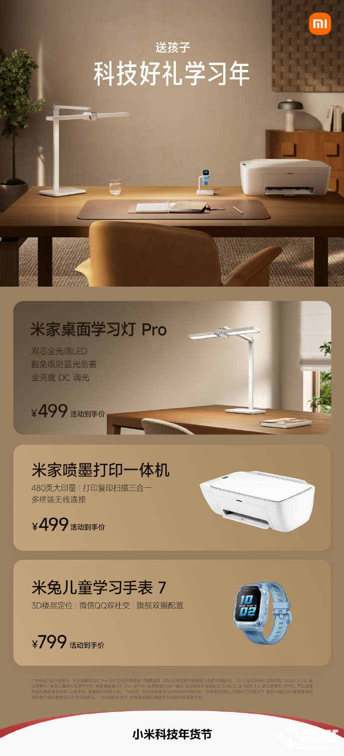 此外,专为学生准备的米家桌面学习灯Pro到手499元、米家喷墨打印一体机到手499元、米家儿童学习手表7到手799元。