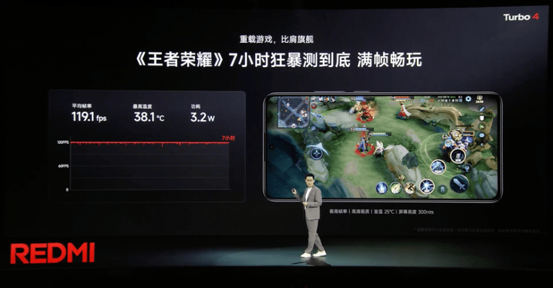 此外,为了充分释放强大性能,REDMI与联发科展开了深度合作,结合了HyperCore与狂暴引擎,深入平台底层微架构,从而实现主流游戏的满帧体验,并显著降低单帧功耗。结合Turbo 4所采用的业内领先3D冰封循环泵散热技术,可以进一步发挥天玑8400-Ultra的强劲性能。在《王者荣耀》的实测中,Turbo 4能够在极致帧率高清模式下持续运行7小时,始终保持120帧水准的稳定表现,且机身温度与功耗控制表现优秀。
