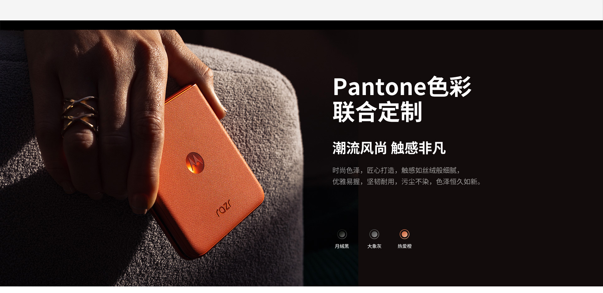 在外观设计上,moto razr 50 延续了经典的razr系列美学。其小巧便携的设计让你轻松放入口袋或手包,成为节日期间的随身利器。三种潘通时尚配色则让它无论何时何地都格外引人注目。此外,机身支持IPX8级防水,结合无线充电功能,让便携性与实用性完美融合,尽显高端质感。