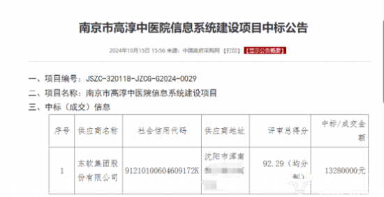 项目进展很快,不到一个月的时间,项目中标结果公布,东软集团以1328万元的报价成功中标。