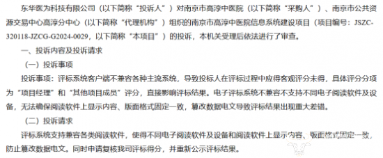 根据政府采购供应商投诉处理决定书-高财诉决〔2024〕1号,东华医为投诉项目采购方,称:评标系统客户端不兼容各种主流系统,导致投标人在评标过程中应得客观评分未得,直接影响评标结果。