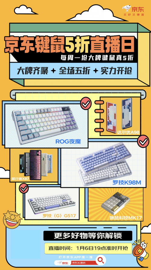 1月6日周一晚7点,京东3C数码采销直播间将开启键鼠5折直播,精选罗技、ROG、达尔优、前行者等知名品牌多款客制化键盘爆品,并为消费者带来限时限量5折抢的福利,先到先得,抢完即止!此外,未来每周一的晚7点,京东采销都将携手品牌带来键鼠5折抢的直播福利,让广大消费者都有机会低价入手心仪的键鼠好物。感兴趣的用户记得打开京东APP搜索“3C数码采销直播间”,机会难得千万不要错过。下面来看看京东这次具体会带来哪些键鼠好物吧。