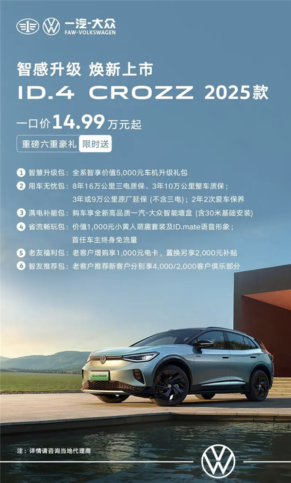 快科技1月3日消息,一汽-大众ID.4 CROZZ的2025款已正式上市,价格区间为14.99-18.59万元。