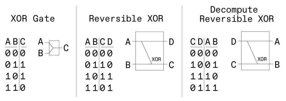 举一个简单的例子,例如异 OR 或 XOR 门。通常,门是不可逆的 — 有两个 inputs,只有一个 output,知道 output 并不能为您提供有关输入内容的完整信息。可以通过添加额外的 output(原始 inputs之一的副本)来可逆地完成相同的计算。然后,使用这两个 outputs,可以在 decomputation 步骤中恢复原始 Importing。