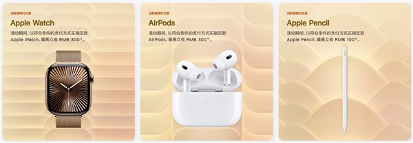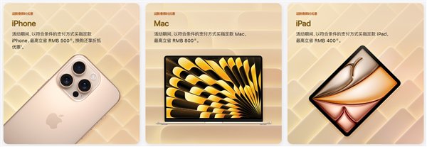 活动期间,以符合条件的支付方式购买指定商品,每位顾客每个产品类别限购2件,最高立省800元人民币,换购新iPhone还享折抵优惠。