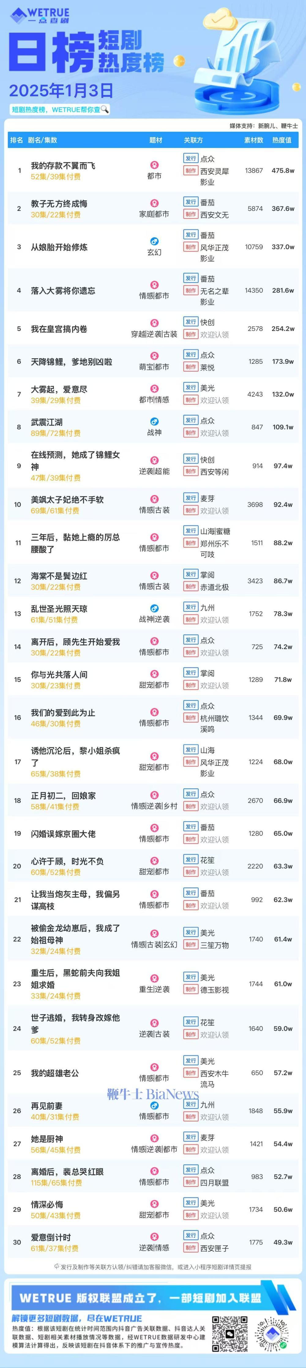 编者按:为帮助短剧从业者提供更多信息,专注于短剧报道的新腕儿和科技媒体鞭牛士联合WETRUE短剧热度榜共同推出短剧热度榜。
