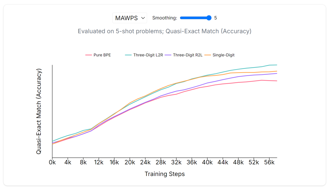 实验选择了 3 种 tokenizer,分别是 GPT-2 的 BPE tokenizer、Llama 3 的三位数 tokenizer(three-digit tokenizer)和 Deepseek 的单位数 tokenizer(single-digit tokenizer)。