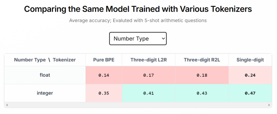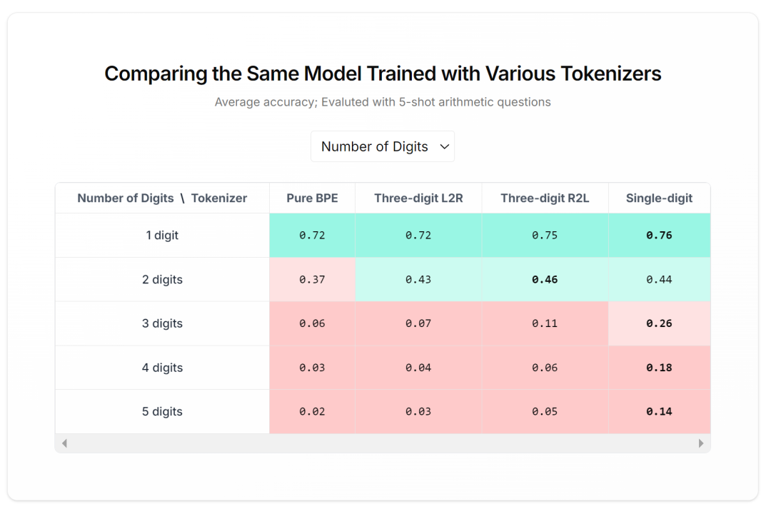 该研究旨在比较多个 tokenizer 以及它们处理数字的不同方式,以尽量减少模型架构、训练配置和预训练数据等外部因素在评估结果中的影响。因此,每个模型之间唯一的区别应该是 tokenizer。