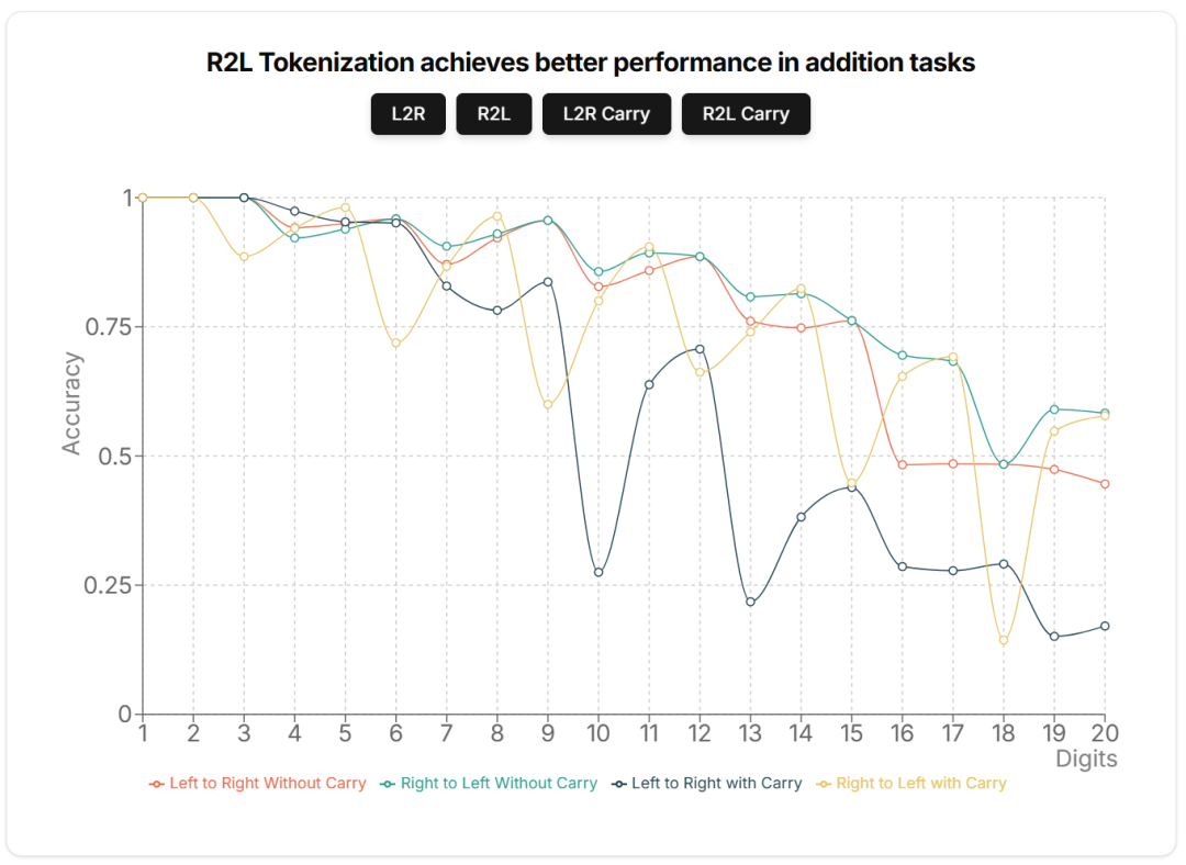 如下图所示,三位数 R2L tokenization 比标准三位数 L2R tokenization 具有更好的性能。