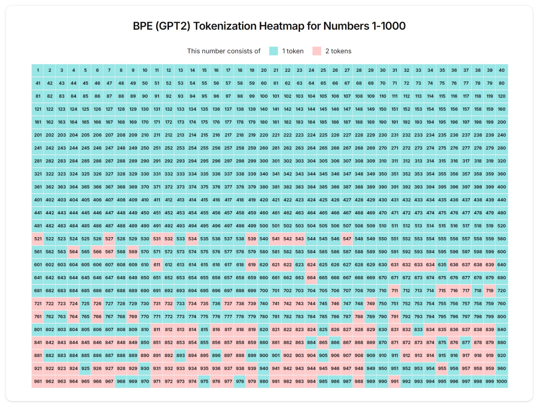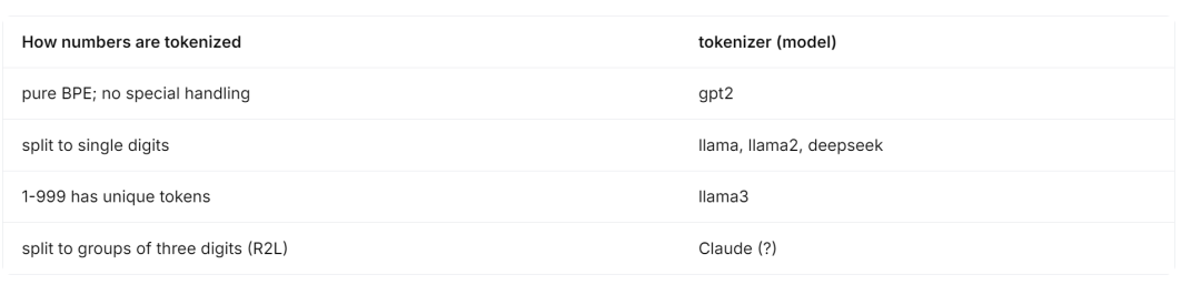 后来,Llama 3 采用了不同的方法来处理数字,将它们 tokenizing 为三位数。因此,从 1 到 999 的数字每个数都有唯一的 token,而从 1000 开始的数字由这些 token 组成。