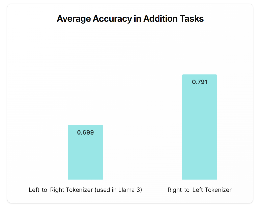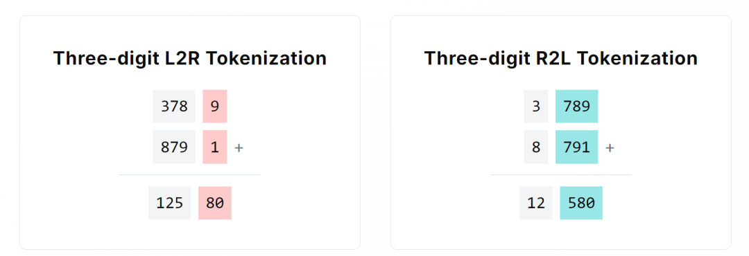 如上所示,在三位数从左到右(L2R)的例子中,9 + 1 应该映射到数字 0,但实际上却与 8 组合在一起形成了 80,因为前面的三个 token(125)已经被分在一起了。tokenization 边界的偏移在学习过程中引入了额外的复杂性,已经证明准确性是有害的。