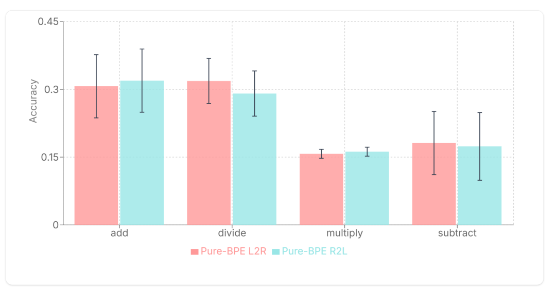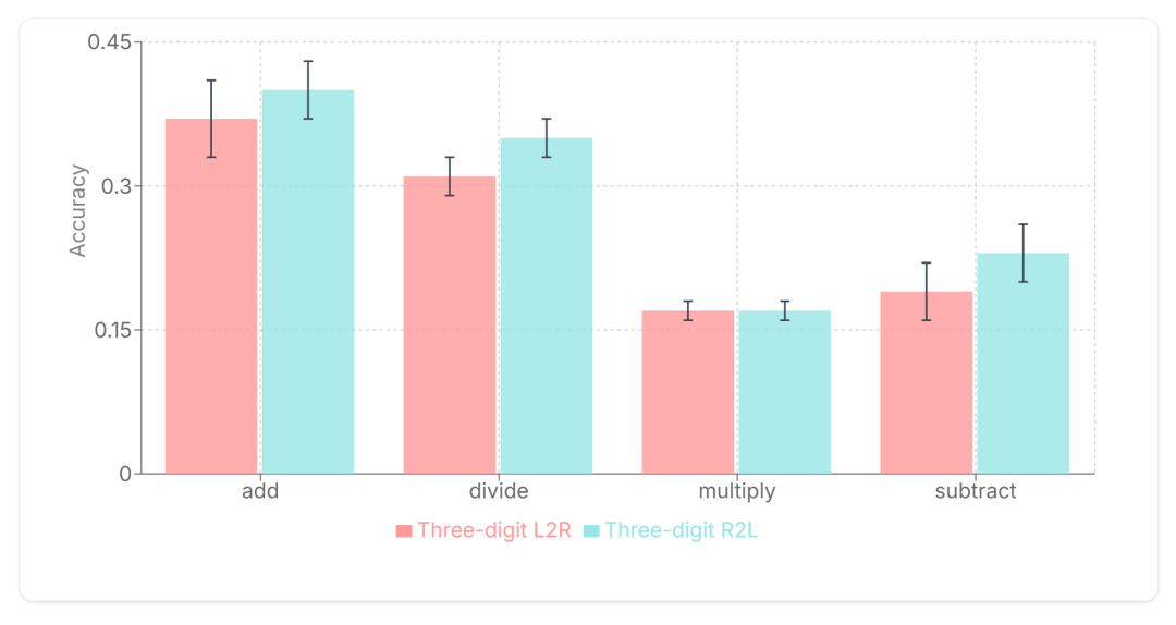 本文发现,与使用默认 L2R token 数据进行训练相比,使用 R2L token 数据进行训练的模型取得了显著的改进(乘法除外)。这表明,与典型的从左到右编码相比,它是算术运算的最佳设置。