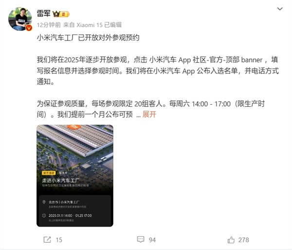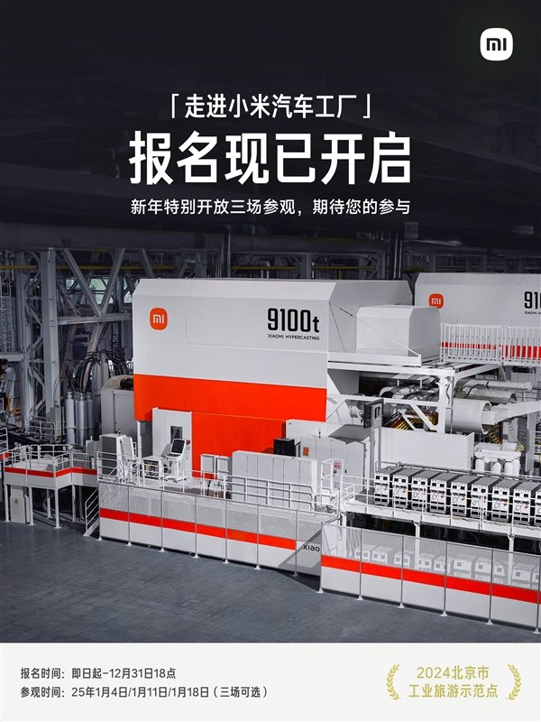 快科技1月4日消息,雷军今天发文透露,小米汽车工厂已开放对外参观预约,同时宣布将在2025年逐步开放参观。