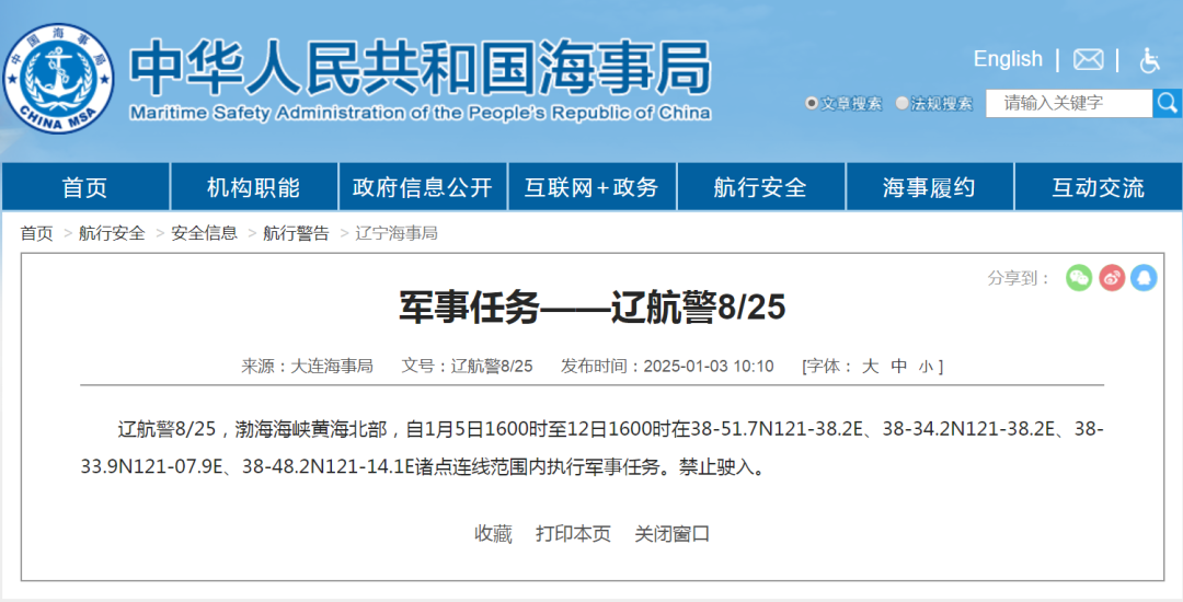 据中国海事局网站消息,大连海事局发布航行警告,1月5日16时至12日16时,渤海海峡黄海北部部分海域执行军事任务,禁止驶入。
