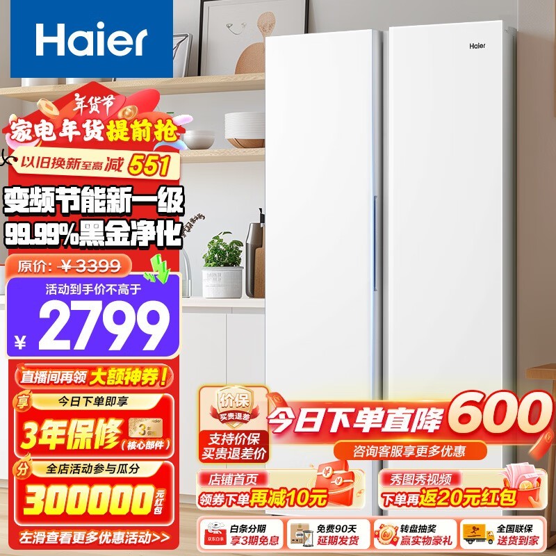 海尔对开门冰箱2749元秒杀!双十二来袭