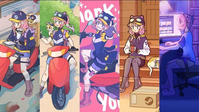 每逢特卖期间,Steam娘就会出现在首页的动态背景横幅中,戴着印有Steam平台Logo的猫耳帽子,骑着不知为何没有后视镜的红色电动车,背着Steam Deck掌机的包裹,似乎在给玩家们送货。