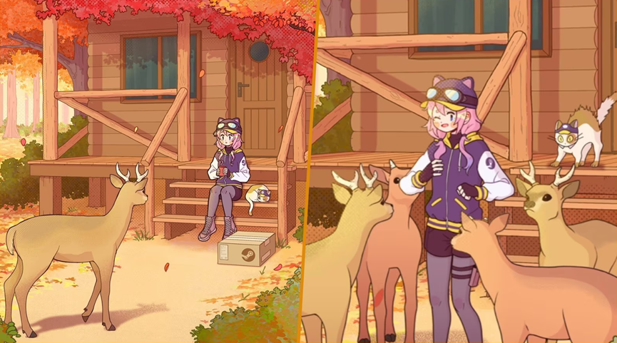 秋天的Steam娘有了些闲暇,来到森林里找小鹿玩,没注意到三花猫吃醋炸了毛。