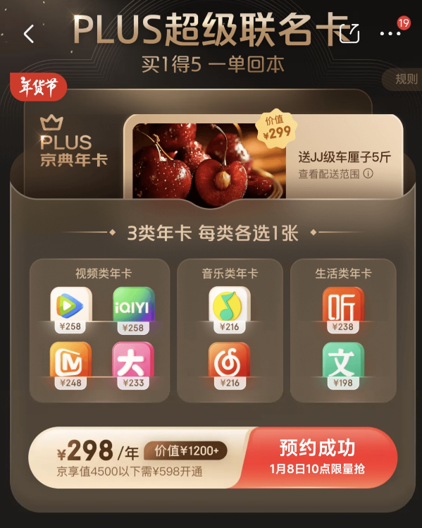 PLUS超级联名卡总价值超1200元,买1得5,其中包含1张京东PLUS会员京典卡、价值299元的5斤JJ车厘子、1年腾讯视频/爱奇艺/芒果TV/B站VIP会员(视频年卡4选1)+1年网易云音乐会员年卡/QQ音乐豪华绿钻VIP会员(音乐年卡2选1)+1年百度文库、喜马拉雅VIP年卡(2选1)。