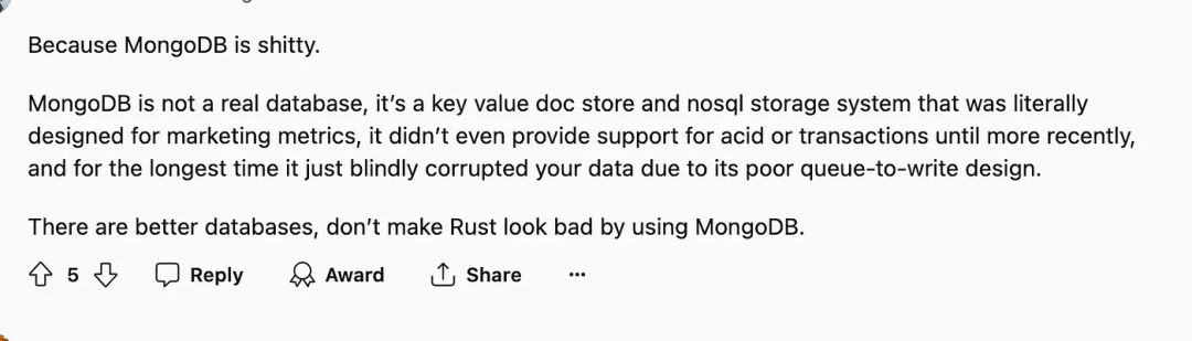 除了 Rust 的设计缺陷,社区氛围也是难评。Austin 表示,社区不能接受别人提出 Rust 有缺陷这个观点。发表的看法会遭到攻击,提出的问题也只能收获阴阳怪气。