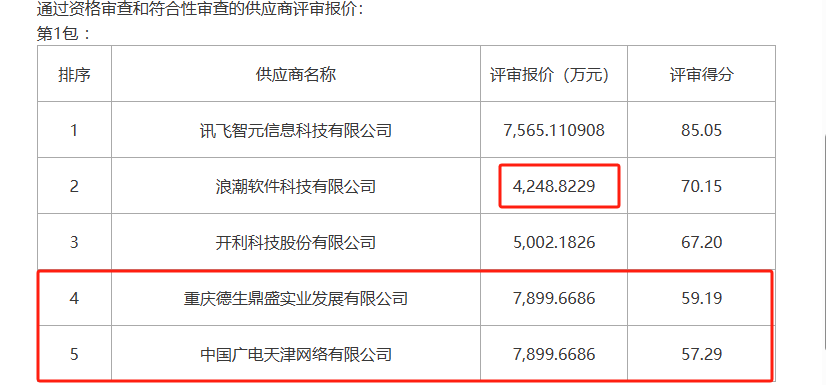 值得注意的是,浪潮软件科技公司也参与投标了,但最终落选,这种情况很常见,并不稀奇。稀奇的是,其投标报价极低,在项目最高限价为8250万元的情况下,浪潮科技给出了4248.8829万元的报价,几乎是五折报价,与最高报价相差约3600万元。虽然浪潮科技报价很低,但很显然,低价策略并未奏效,最终只能空手而归。