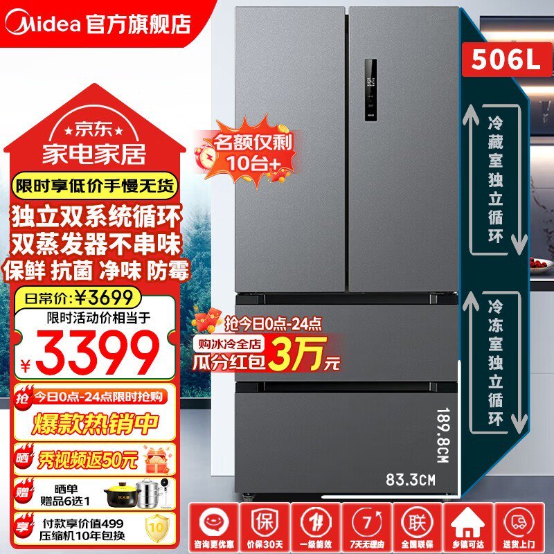 美的四门冰箱3399元到手满减300元!