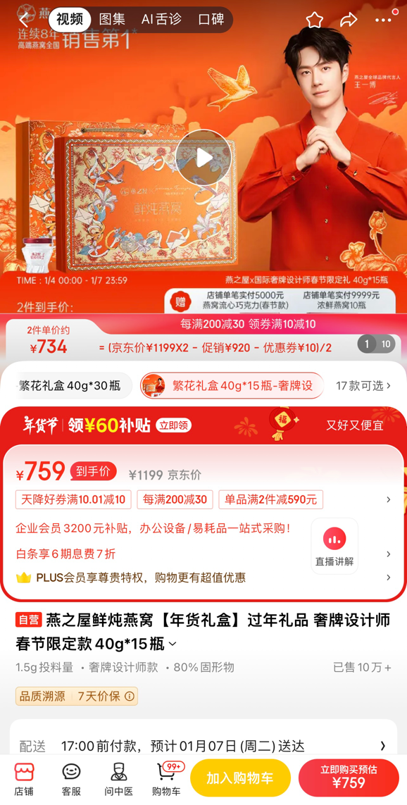 春节是走亲访友的节日,为亲友带上一份健康好礼更显满满心意。燕之屋鲜炖燕窝春节限定款40g*15瓶,由国际奢派设计师Iracema Trevisan倾力打造,创造质感丰富和风格鲜明的精美包装,为春节增添喜庆气氛。这款燕窝固形物超过80%,入口爽滑饱满,并且只含燕窝、纯净水和冰糖,配料表更干净。原价1199元,现到手价仅759元。