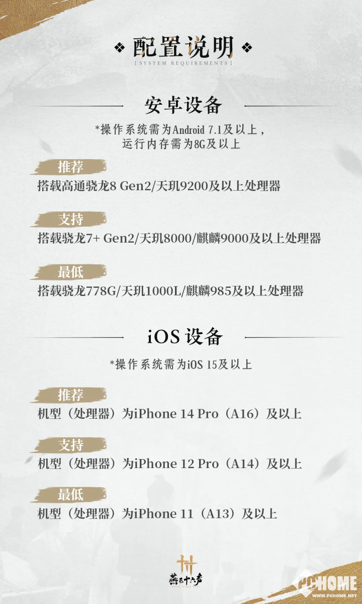 机型适配方面,《燕云十六声》对于安卓设备有明确的适配要求。首先,操作系统需为Android 7.1及以上版本,且运行内存要达到8G及以上。在处理器方面,推荐搭载高通骁龙 8 Gen2或天玑9200及以上处理器的设备;支持搭载骁龙7+ Gen2、天玑8000或麒麟9000及以上处理器的设备;最低要求则是搭载骁龙778G、天玑1000L或者麒麟985及以上处理器的安卓设备。对于iOS设备,《燕云十六声》也做出了相应规定。操作系统必须是iOS 15及以上版本。推荐的机型为iPhone 14 Pro(A16处理器)及以上;支持的机型为iPhone 12 Pro(A14 处理器)及以上;最低要求是iPhone 11(A13 处理器)及以上机型可以运行该游戏。这些配置要求确保了游戏在不同iOS设备上能够有较好的运行体验。