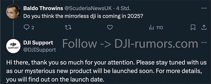 日前,一位名叫 "Baldo Throwins" 的网友在大疆的官方社交平台上提出了一个问题:“你认为大疆的微单相机会在2025年发布吗?”。官方客服竟然回复了类似以下的内容:“您好!感谢您联系到我们,我们即将发布一款神秘的新产品,更多详情将在发布时揭晓。”。虽然我们无法确定这条回应是否由人工客服还是AI生成,但大疆这一消息让更多摄影爱好者开始猜测,似乎大疆正在悄然筹备其首款微单相机。