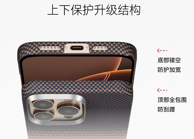 仅有好看还不够,要有一个好手感才是手机壳的重点,PITAKA日落编织手机壳能够将磁吸圈巧妙融于保护壳之中,所以手感更加轻薄,整个手机壳仅17.95g,更无感,并且薄至0.88mm,更薄才会还原裸机手感,使用更舒适,仅薄还不够,其实还升级了上下保护结构,顶部选择了全包、底部则是镂空。