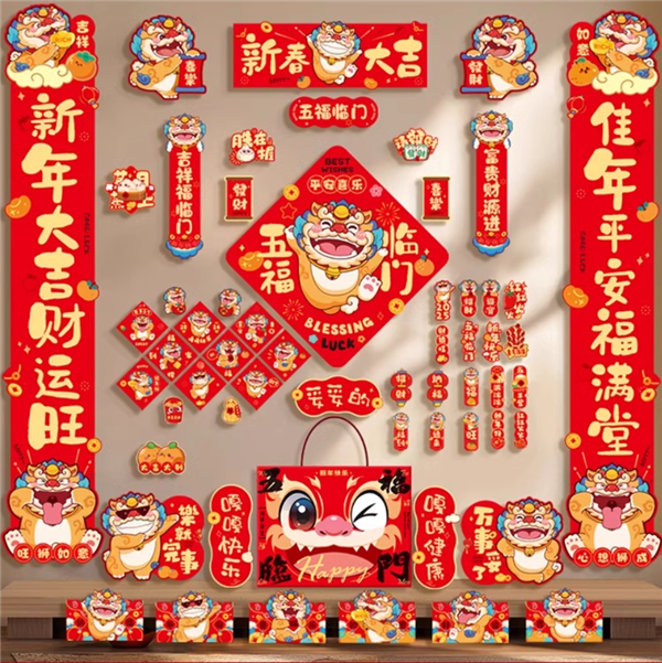 包含:1.3m 对联 * 1+1.1m 对联 * 1 + 福门贴 2 张 + 财神贴伊 * 1 + 车贴 * 1 + 蛇年生肖贴 1 对 + 春晖 2 张 + 小福字 10 个 + 红包 6 个 + 窗花 10 张 + 迷你对联贴 139 贴 + 春联胶片 * 60 片 + 礼包袋 * 1。