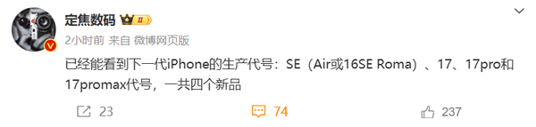 1月6日,博主@定焦数码 透露,新一代iPhone的生产代号已经浮出水面,包括新款iPhone SE(或iPhone 16E)、iPhone 17标准版、iPhone 17 Pro和iPhone 17 Pro Max,共四款新品。但他没有透露具体的代号。