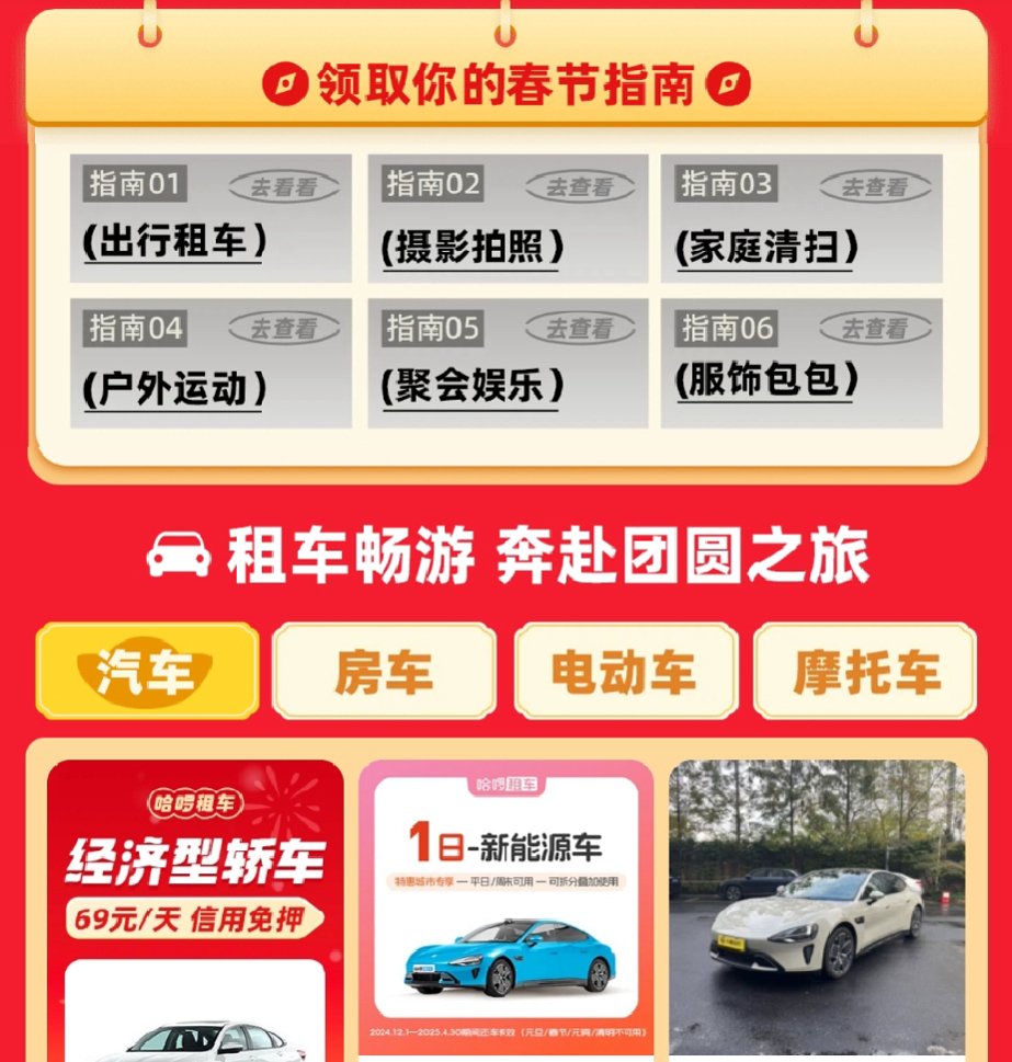 新年租个车带上全家人回家过年、租个吸尘器擦窗器整齐迎接新年、租套户外装备带上家人出去玩。春节对于中国人来说,是忙碌了一年的人们回家欢聚的节日。与往年不同,在以“租”代“买”这一新的形式正慢慢成为更多人的选择。