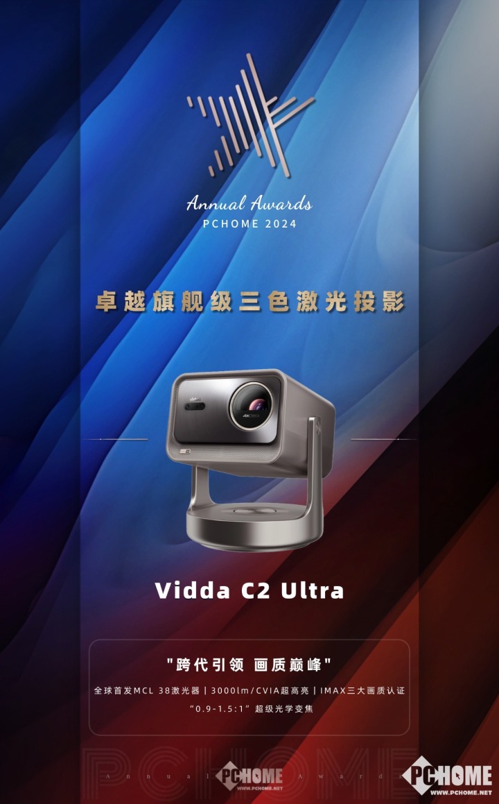 PChome一年一度的年度卓越产品评选已经落下帷幕,2024年度共有数十款产品中脱颖而出,获得年度奖项。作为一家成立28年的科技垂直媒体,PChome始终恪守严谨、公平、公开、公正、客观、专业的媒体底线,为广大网友甄选优秀产品,这是我们的使命,也是我们的立身之本。在本次评选活动中,Vidda C2 Ultra投影获得PChome 2024卓越旗舰级三色激光投影奖项。