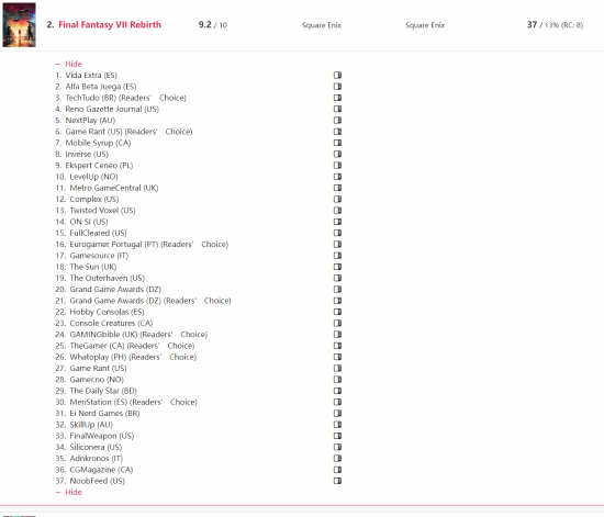 Square Enix《最终幻想7:重生》位列第二,共获得了37项奖项;