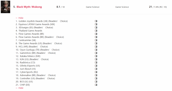 国产游戏《黑神话:悟空》排在第五,共获得21项年度最佳奖项。