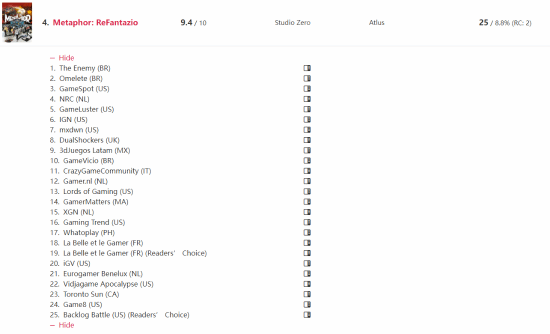 Atlus《暗喻幻想》排在第四名,共获得了25项年度最佳;