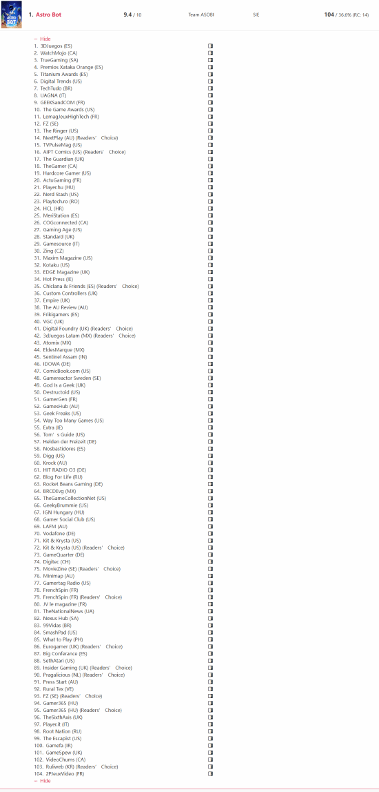 推主@NextGenPlayer消息,根据GOTY Award Tracker网站最新统计数据显示,索尼第一方游戏《宇宙机器人》在2024年共获得了104次“年度最佳奖项”强势领跑,成为有史以来获奖最多的“平台游戏”。