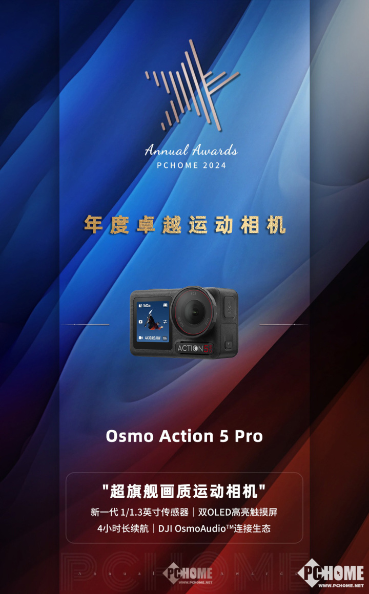 在PChome2024年度科技产品评选活动中,大疆Osmo Action 5 Pro荣获年度卓越运动相机奖项。