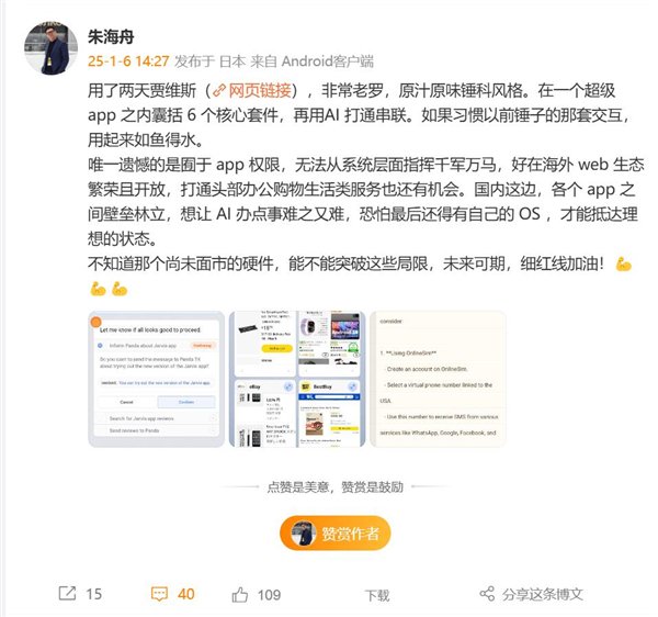 朱海舟还表示,不知道那个尚未面市的硬件能不能突破这些局限,未来可期,细红线加油。