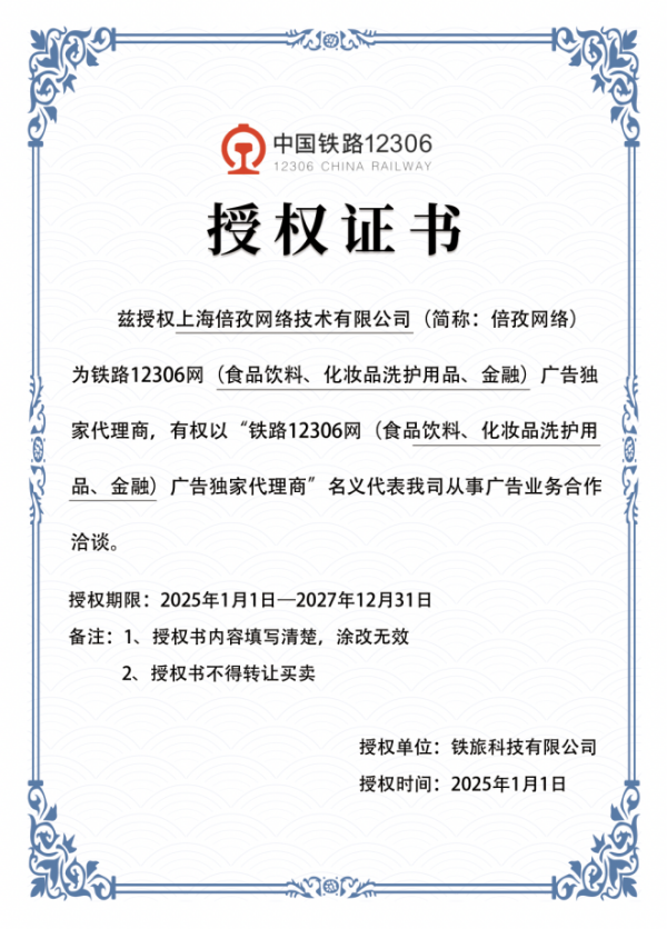近日,倍孜网络凭借强大的技术实力、丰富的品牌资源与卓越的服务体系,成功中标铁路12306 APP数字媒体产品代理项目,成为铁路12306 APP食品饮料、化妆品洗护用品、金融三大核心行业独家代理商。