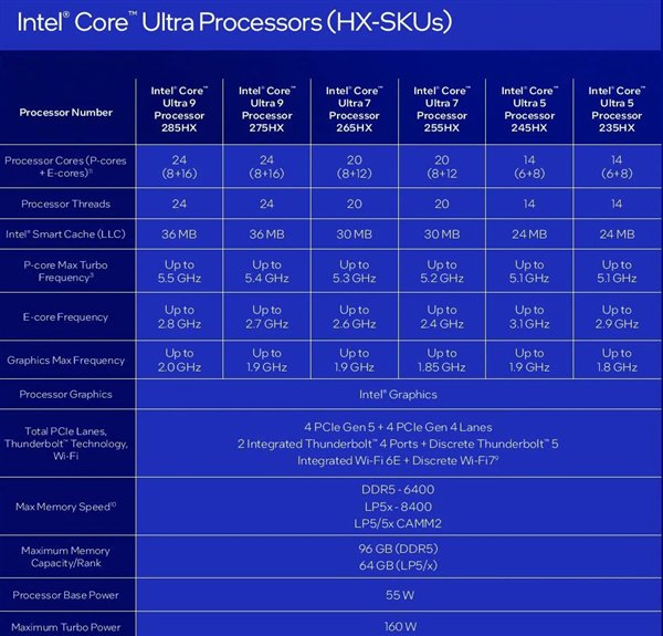 具体型号一共有六款,旗舰叫做酷睿Ultra 9 285HX,8+16 24核心24线程,36MB三级缓存,P/E核最高频率5.5/2.8GHz,核显频率2.0GHz。