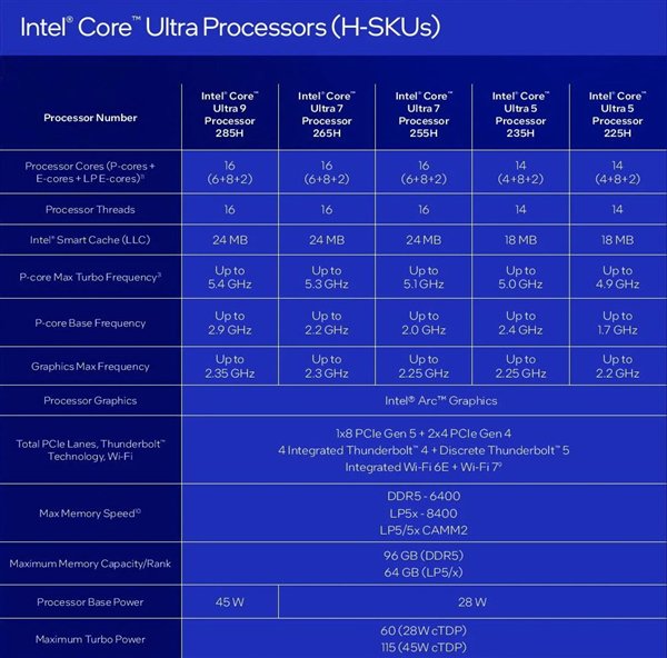 一共有五款不同型号,旗舰为酷睿Ultra 9 285H,6+8+2 16核心16线程,24MB三级缓存,P/E核最高频率分别5.4/2.9GHz,核显频率也有2.35GHz。