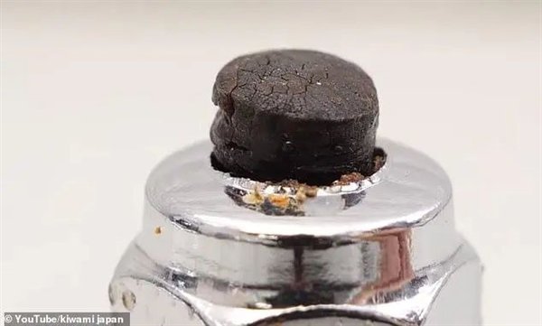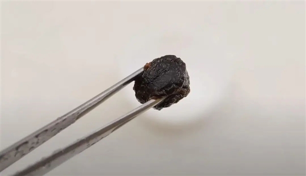 再将指甲米糊压入特制的模具,放入烤箱里,150摄氏度烤一个半小时,拿出来后指甲米糊初步有了黑钻的样子:黑色的一颗。