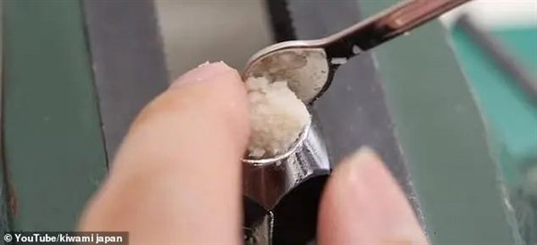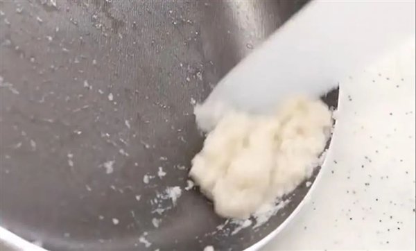 指甲被收集在一个透明容器中,凑够量后打磨成粉(他还用了咖啡豆研磨机),然后加上水混合,这个时候,指甲已经改变其原有的模样,如同米糊。