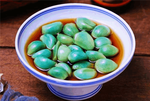 腊八蒜在腌制过程中,先生成一种蓝色素,后生成一种黄色素,两种色素“一拍即合”,混合后便成了绿色。