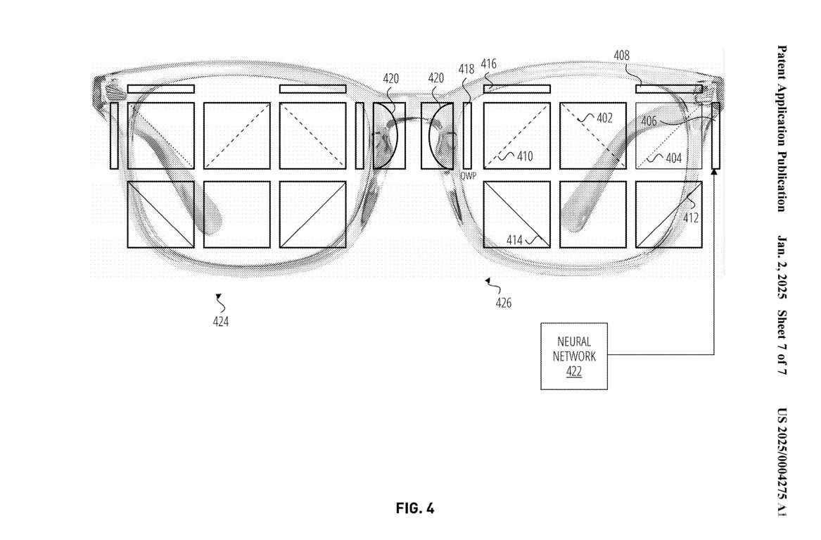 专利还显示,AR眼镜的大概外观为一副普通眼镜,重量大概和Meta Ray-Ban相当,镜片为全透明,并支持双目显示,眼镜左右上方各一颗摄像头。
