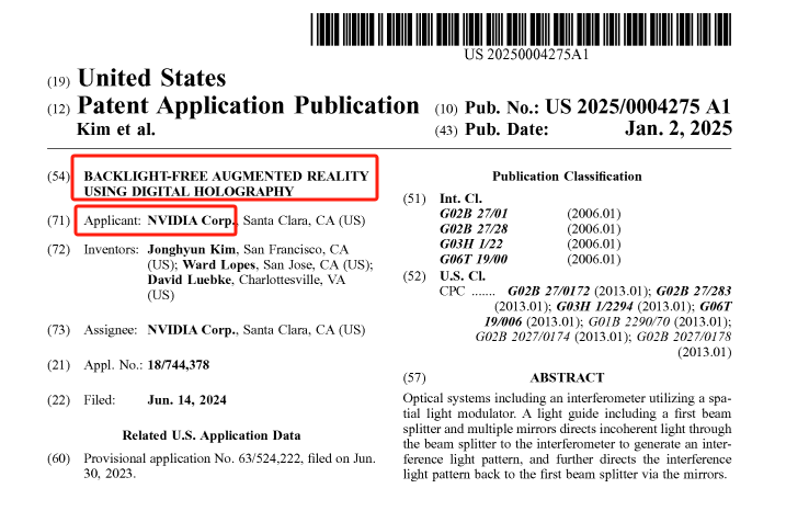 日前,英伟达在美国专利及商标局官网公开了一项名为“无背光增强现实数字全息技术”的AR眼镜专利(专利号US20250004275A1)。